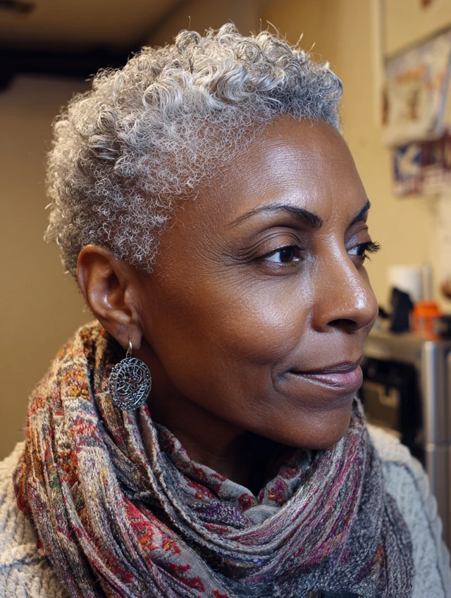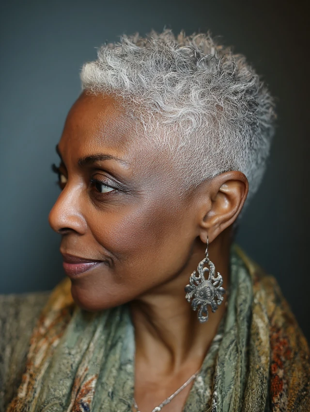 A tapered cut frames the face and brings natural volume, letting your gray coils shine with softness and sophistication.