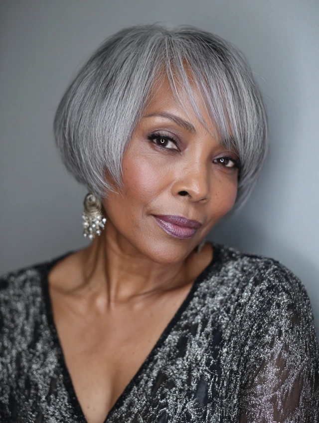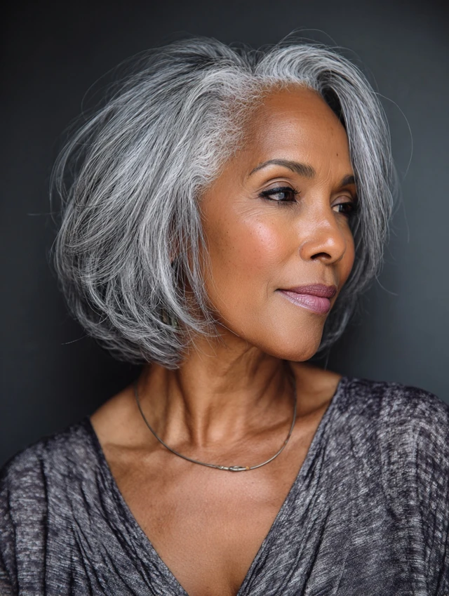 A bob gives thin or fine strands thickness while showcasing gray tones with chic precision.