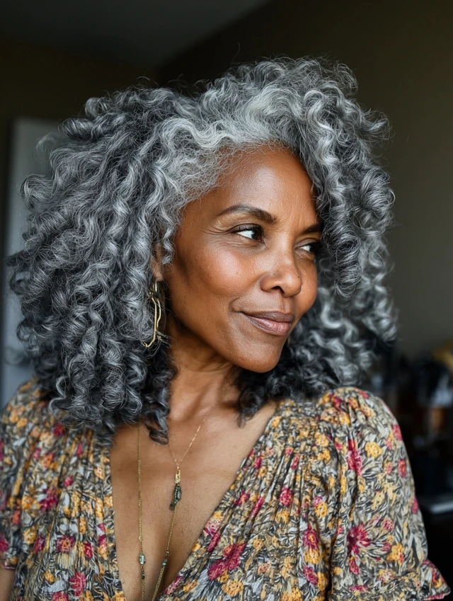 The mix of gray and natural tones creates beautiful dimension, making curls look fuller and more defined.