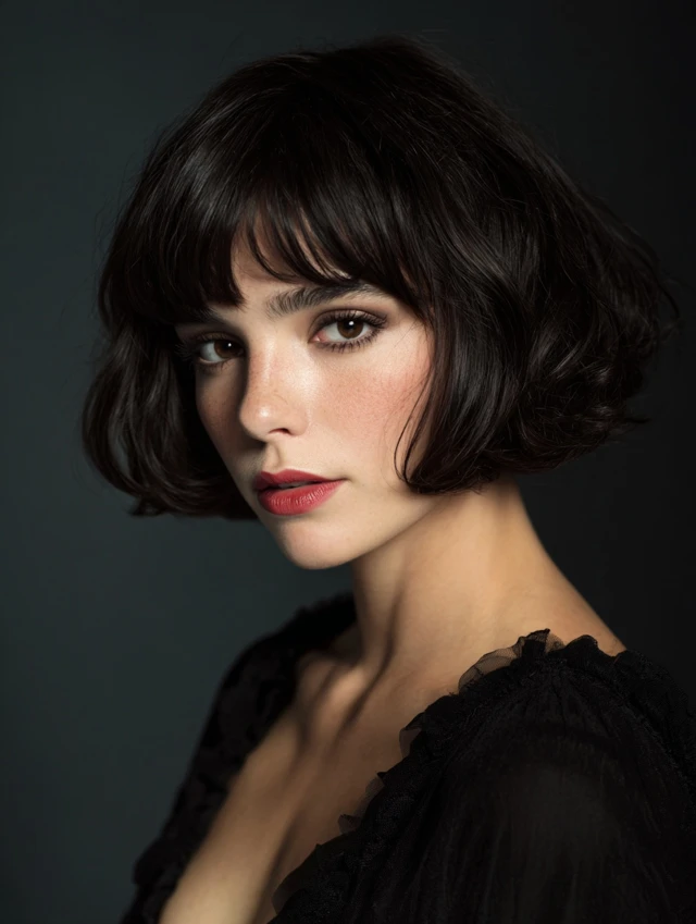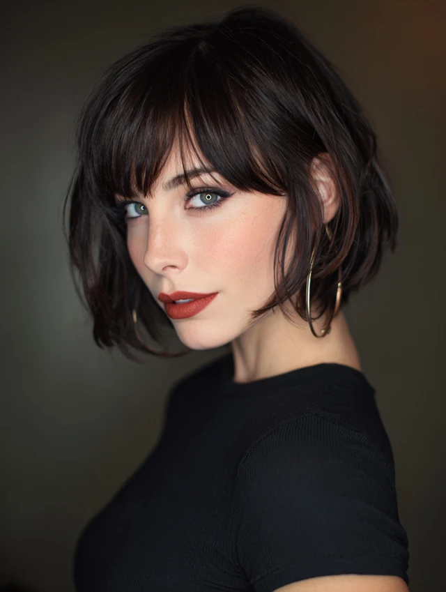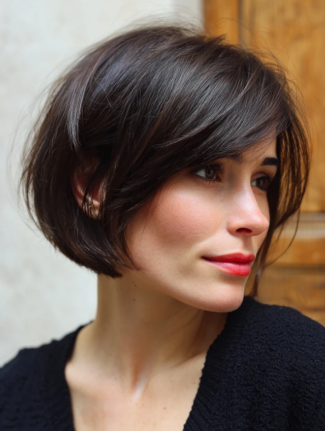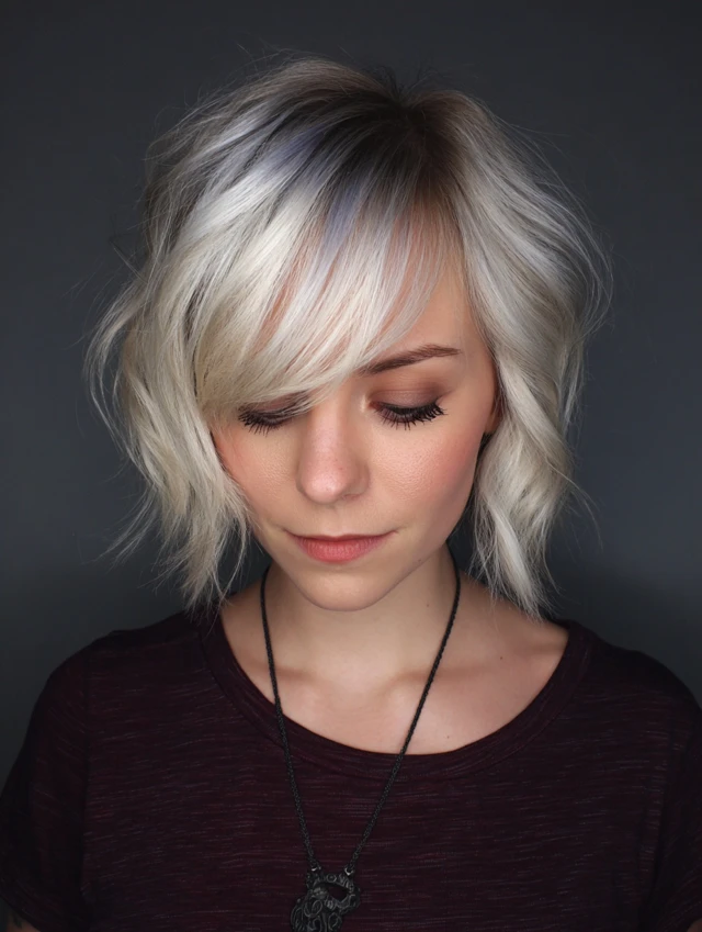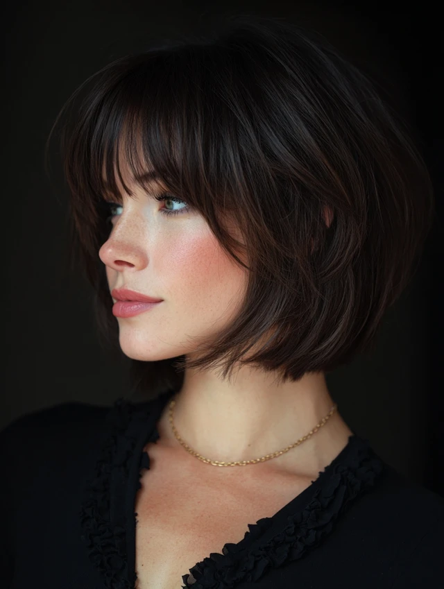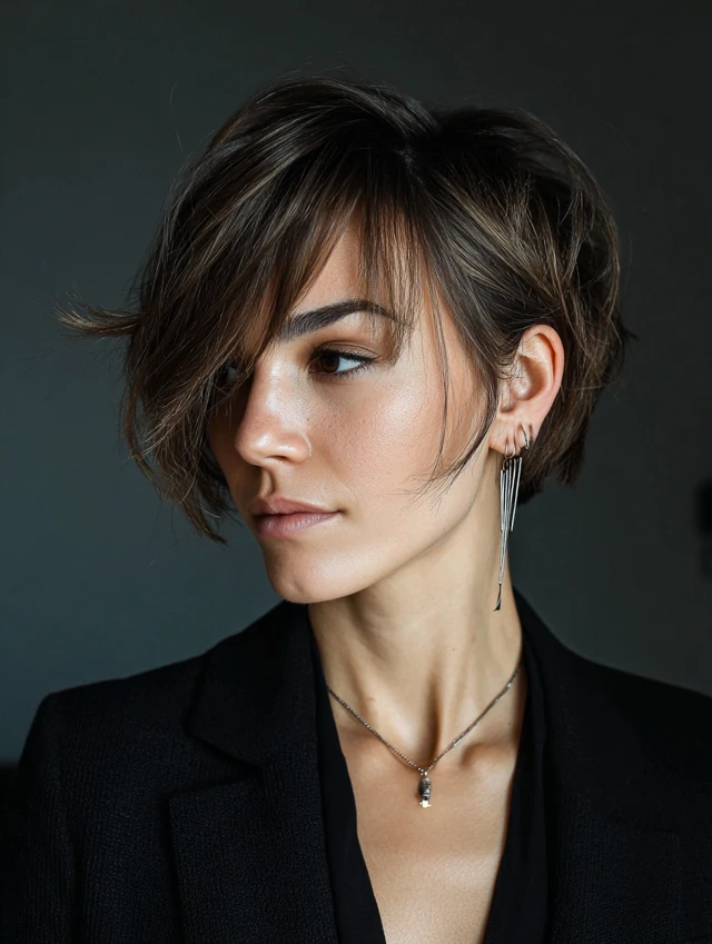 Side-swept bangs frame the face and soften features while offering a stylish edge.