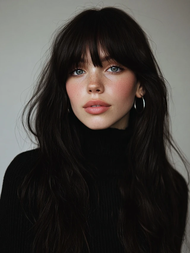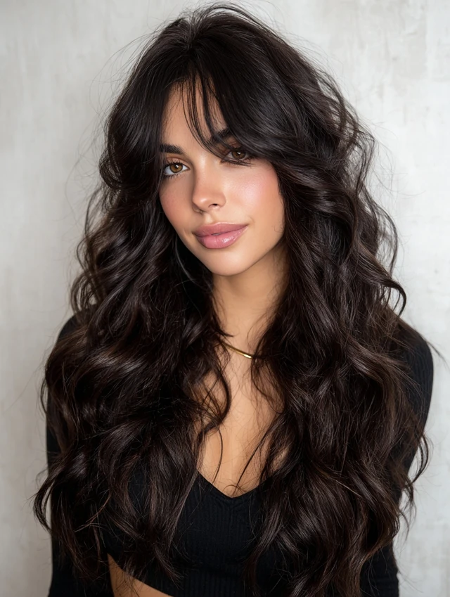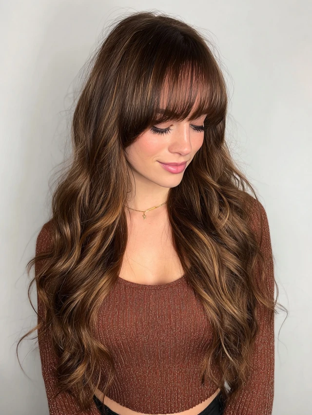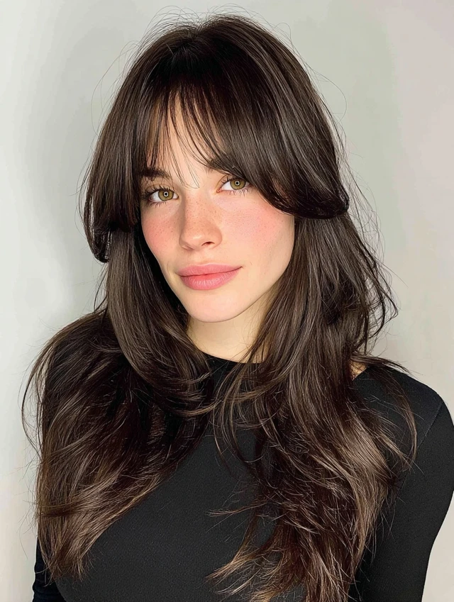 Curtain bangs blend seamlessly into layered lengths, creating softness and volume.
