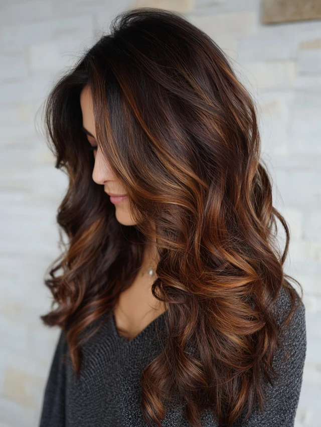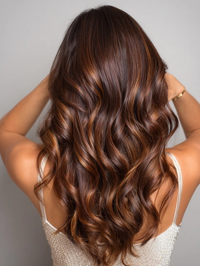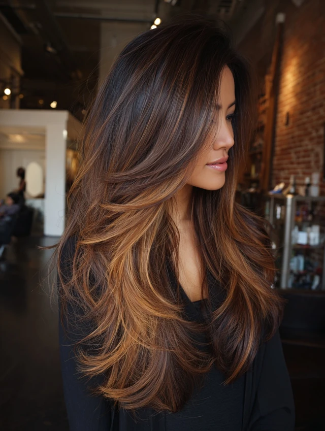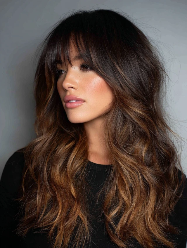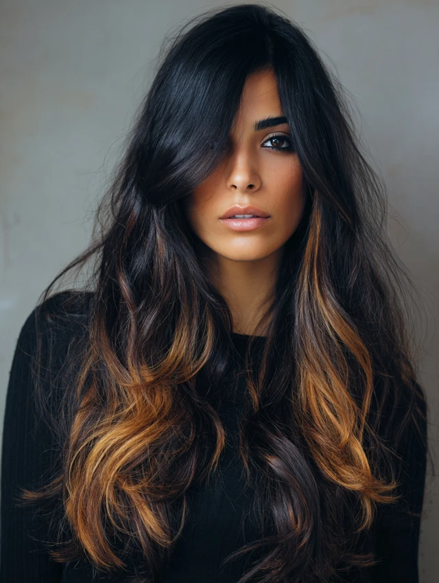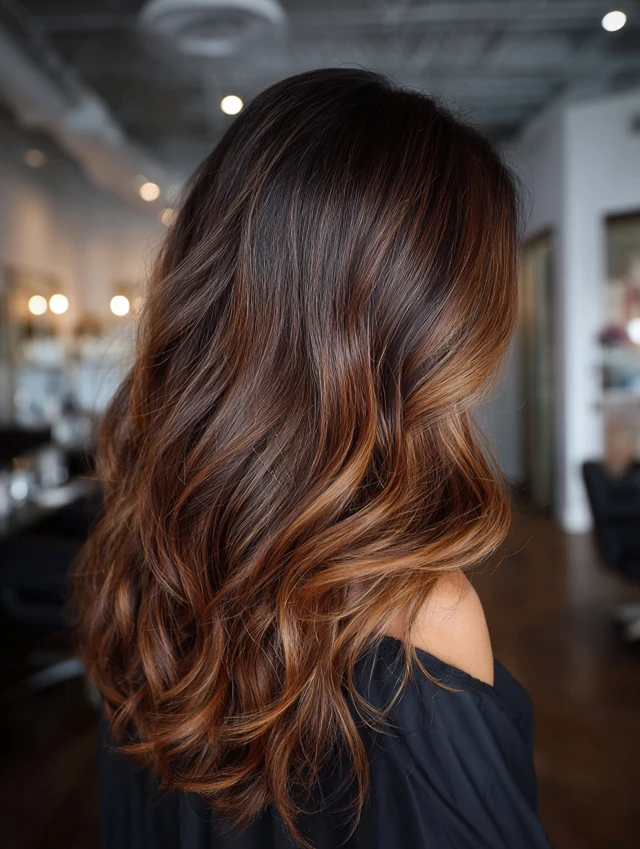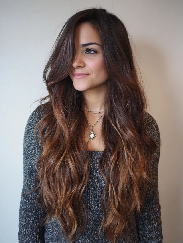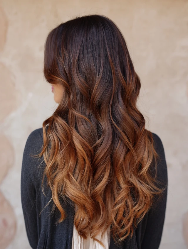 A gradual caramel fade from mid-lengths to ends creates dramatic yet natural dimension.