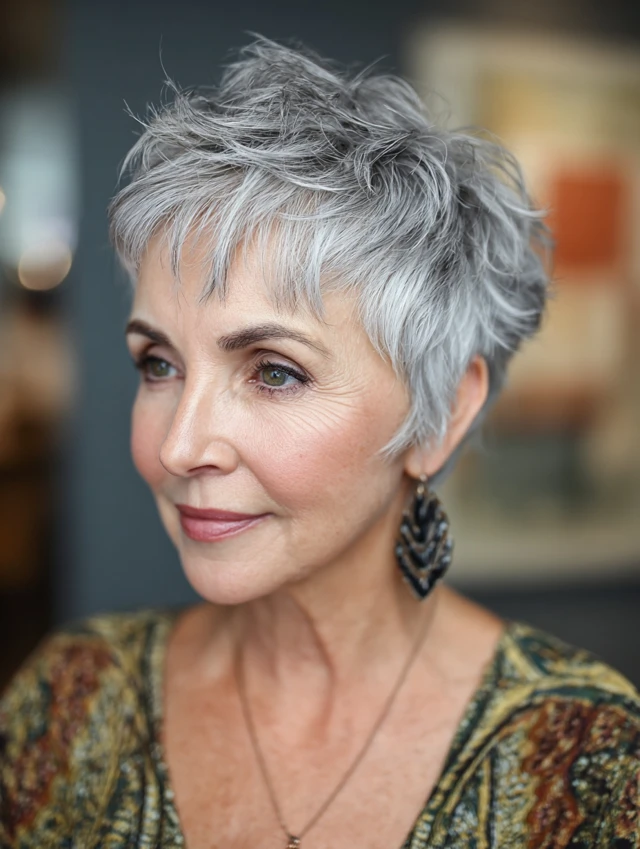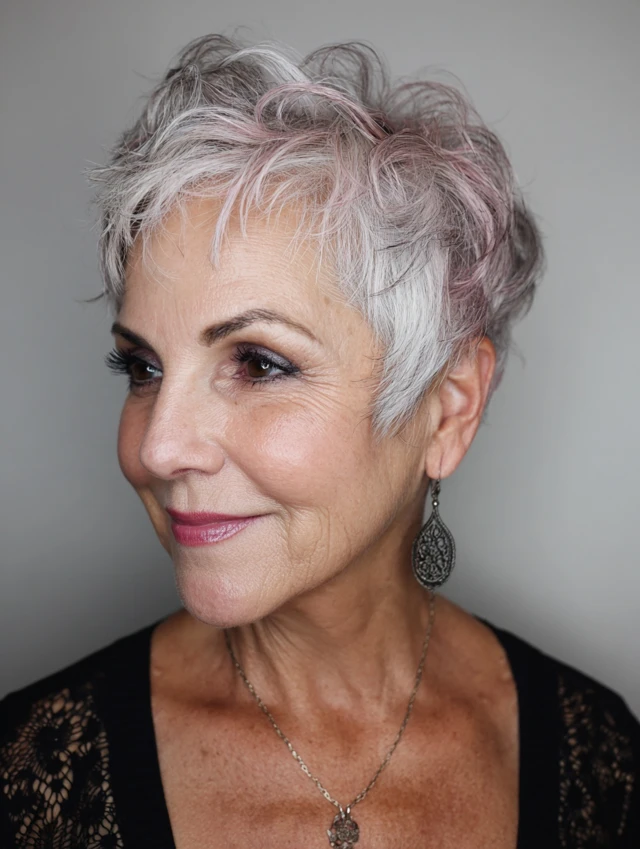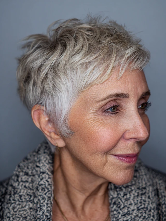 A pixie with lift at the crown creates length in the face, minimizing a double chin visually.
