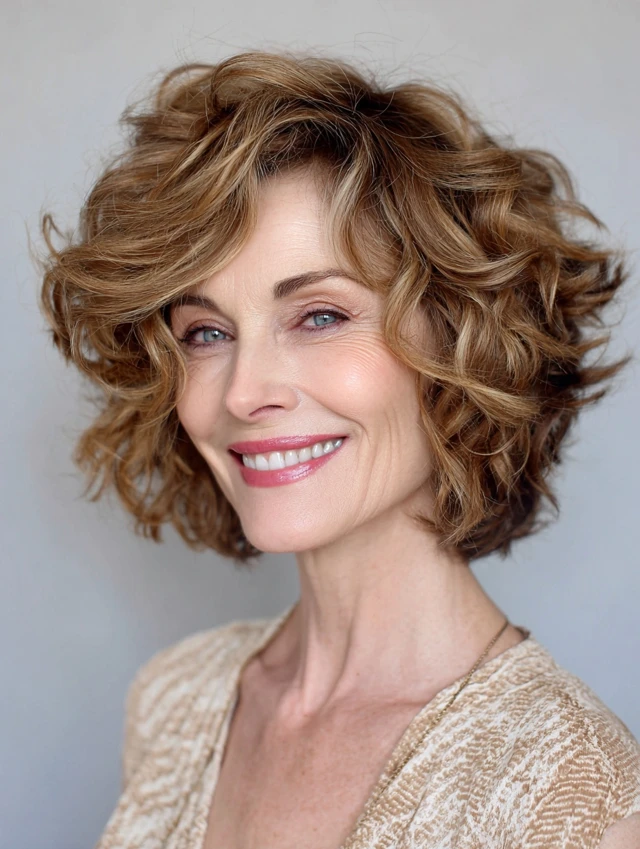 Curly bangs or layered front sections soften facial lines.