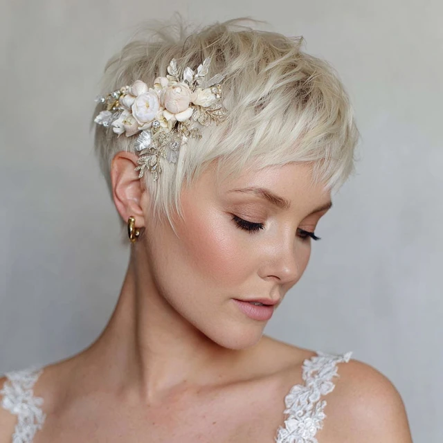 Texture adds depth and movement, while accessories bring in a bridal element without overwhelming your short style.