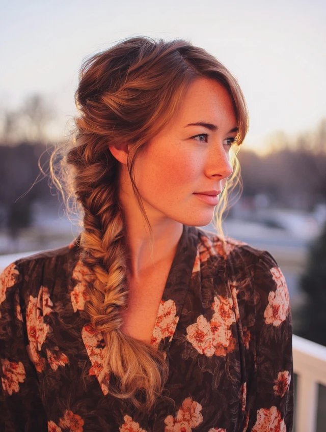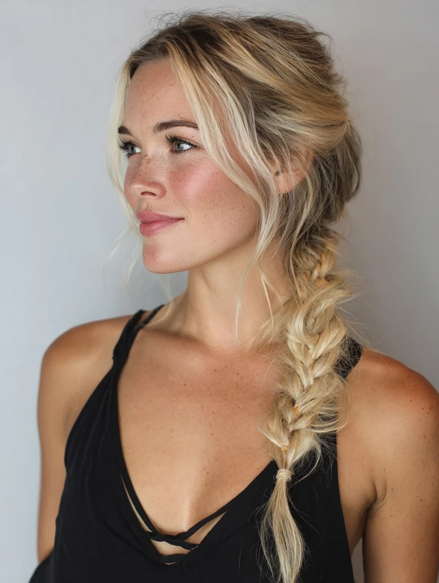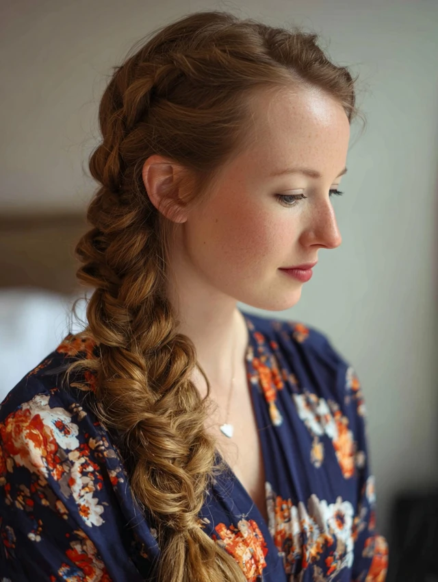 - Sweep hair to one side and braid loosely.