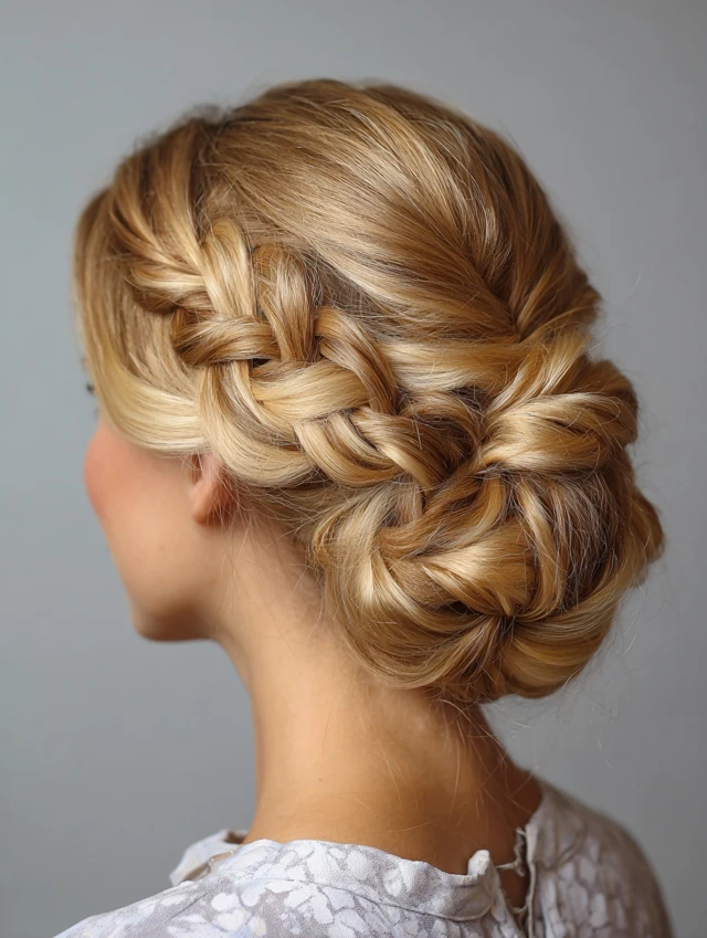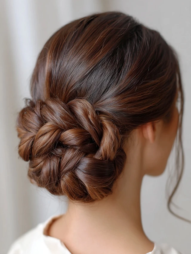 - Wrap braids into a bun and secure with pins or a scrunchie.